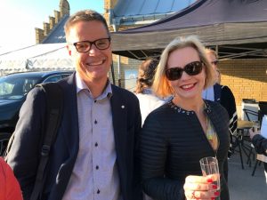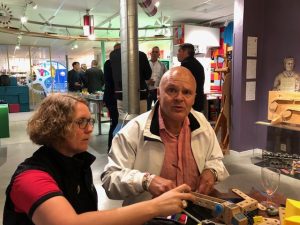 Arkitekten Jerker Söderlind får hjälp med leksaksbygge av Lisa Bergh som förestår science centret Fenomenalen där buffé och kluriga finurligheter serverades.