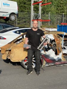 – Det finns ett batteri, en elmotor, en gaspedal och en växelväljare i elbilen. Det är allt, att jämföra med alla hundratals delar i en bensinbil. Om några år når vi skiftet, där det är billigare att göra ett batteri än en fossilbil, och då står vi med ett lager bestående av 250 000 mer eller mindre osäljbara delar. Oavsett vad vi tycker om utvecklingen är det dit vi är på väg, vilket betyder att vi som demonteringsföretag måste ställa om – nu. Även för oss som ligger längst fram är omställningen enorm. Men vi måste göra det och vi måste lära oss handskas med elbilarna på ett säkert sätt på verkstäder och här vid sista anhalten.