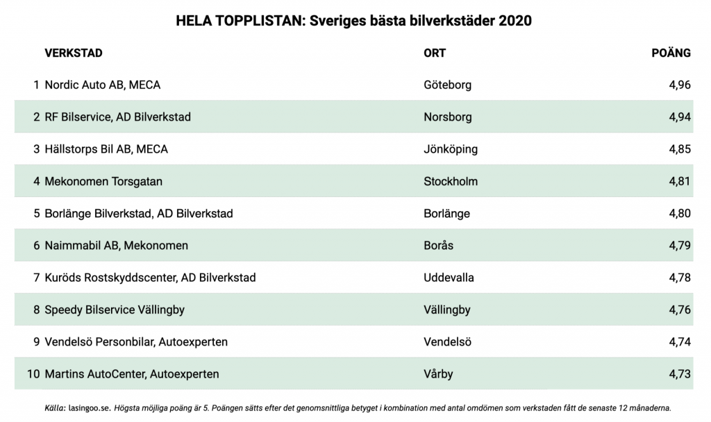 Verkstadsportalen Lasingoo har presenterat listan över sina verkstäder med högst kundnöjdhet de senaste tolv månaderna. Högst på listan hamnar förra årets vinnare Nordic Auto i Göteborg.
