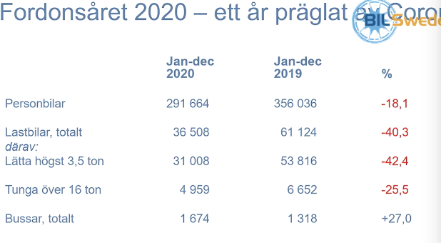 2020 summerat: Personbilar tappade 18,1 procent registreringar (på tre år ett tapp på 90 000 fordon), lätta lastbilar 42,4 procent, tunga fordon 40,3 procent. Bussarna gick mot strömmen och ökade med 27 procent. Rekordår för laddbara bilar som ökade med 132 procent, under december med 251 procent.