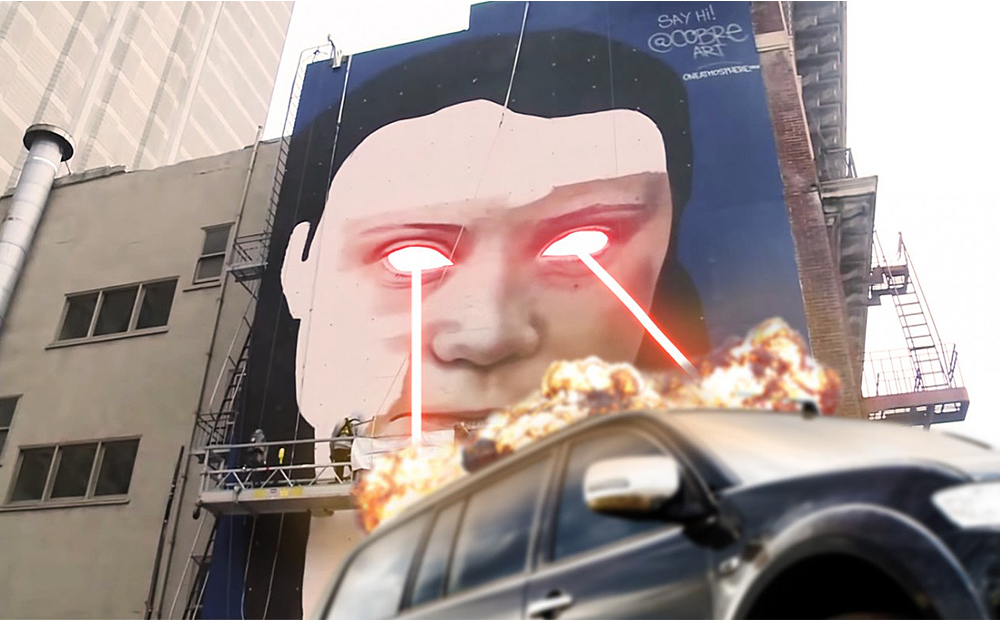 Greta skjuter laserstrålar som får alla förorenande suv-bilar att försvinna.