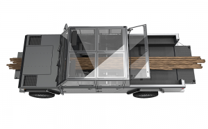 Den mest galna funktionen är en öppning i fronten som gör att man kan köra 4,80 meter långa plankor utan att de sticker ut. Hela 40 stycken 2×4-plankor får plats. Om du inte har något emot att den sticker ut några meter så kan du till och med köra en hel flaggstång.