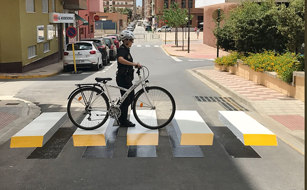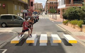 Det här övergångsstället ligger i den lilla staden Almussafes, ungefär två mil söder om Valencia. En gatumålning har skapat en spännande 3D-illusion som ska få bilar och lastbilar att sakta ner. Bilden har skapats på ett övergångsställe på gatan Calle de Ausias March. Övergångsstället är mycket använt eftersom det leder till en idrottshall.