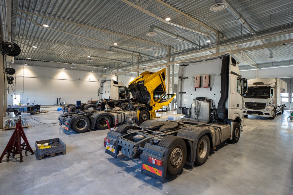 Här finns en renodlad lastbilsanläggning i storformat, med verkstadsyta på totalt 2 400 kvm som har plats för nio lastbilar med släp samtidigt. Två av platserna har smörjgrop och här finns möjlighet att lyfta upp ett helt 25,25 meter långt ekipage. Dessutom finns tvätthall.
