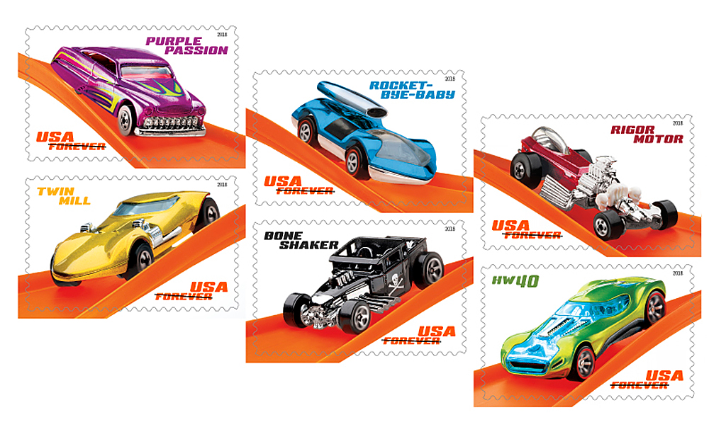 Den amerikanska posten, United States Postal Service, satsar nu på miniatyrer. Det är för att fira 50-årsjubilerande Hot Wheels-bilarna som flera av de mest galna modellerna nu blir frimärke.