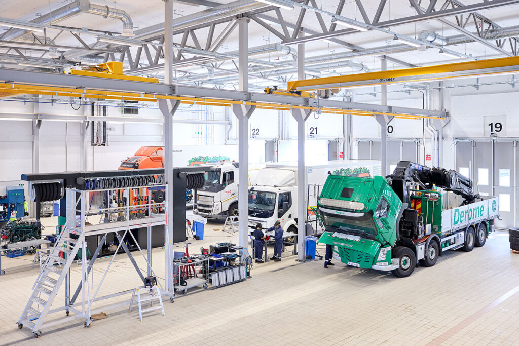 Här finns däckverkstad och skadeverkstad, framtidssäkrade för att ta hand om tunga fordon med olika drivlinor.