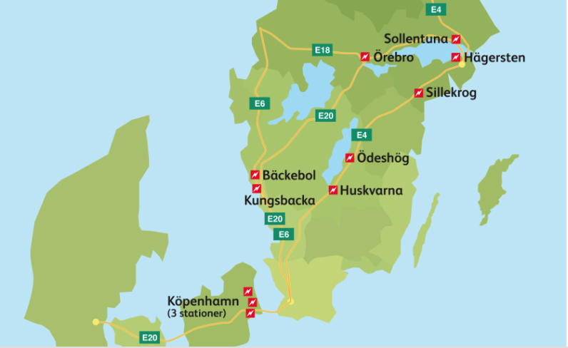 OKQ8:s stationer i Sollentuna (Emblavägen), Örebro (Västhagagatan), Hägersten (Kontrollvägen), Tystberga (Sillekrog södergående), Ödeshög (Liljekonvaljvägen), Kungsbacka (Energigatan), Huskvarna (Grännavägen) och Bäckebol (Transportgatan) blir de första stationerna med supersnabbladdare.