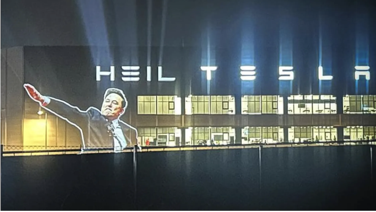 Tyska aktivister satte i veckan upp denna skylt på en av Teslas fabriker, efter Musks heilande i direktsändning.