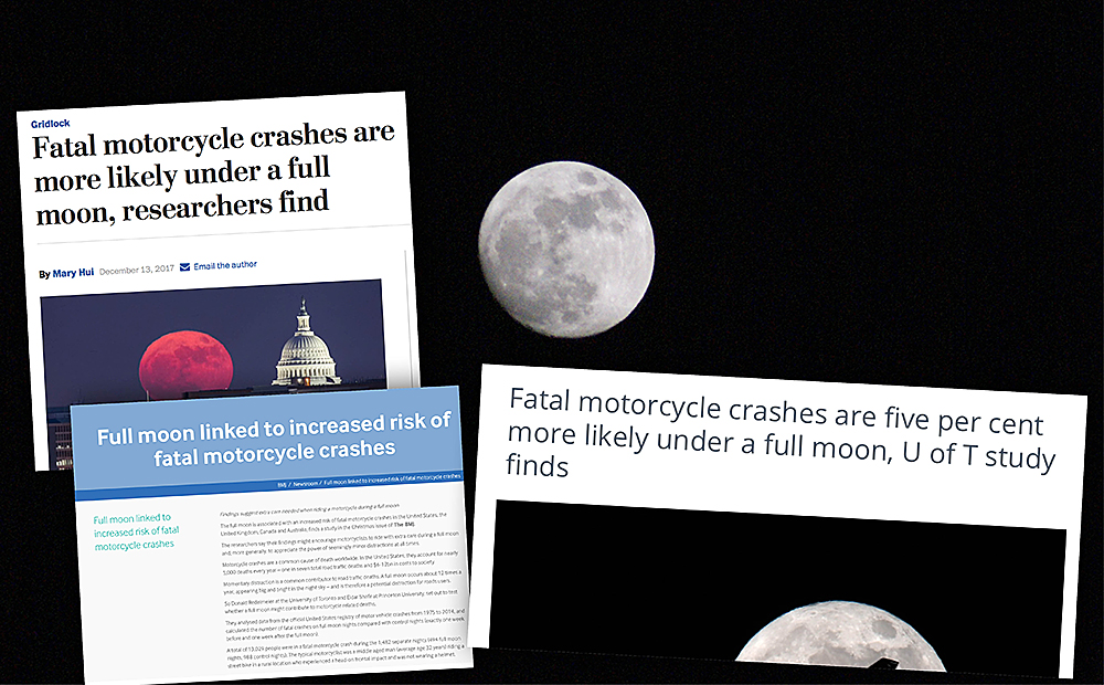 Det är farligt att köra motorcykel när det är fullmåne. Antalet dödsolyckor ökar med fem procent under de cirka tolv tillfällena varje år då månen lyser som bäst. Forskare vid University of Toronto och Princeton university har gått igenom 30 års olycksstatistik i både Storbritannien, USA och Kanada.