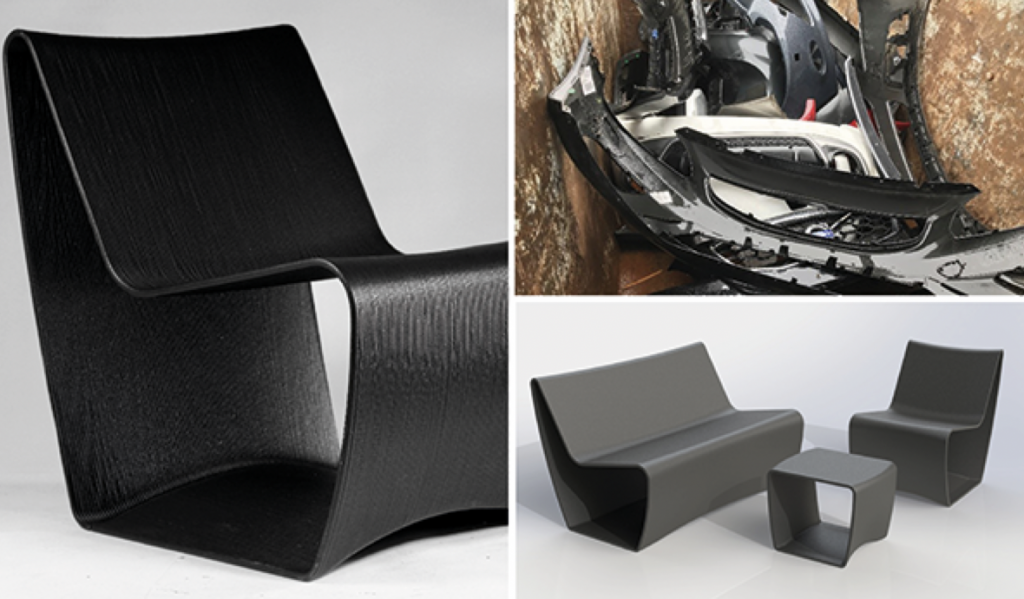 En ny bil består av ca 20 procent plast. Varje år återvinns runt 200 000 uttjänta bilar i Sverige. Dessutom är ungefär 600 000 bilar inblandade i olyckor som innebär att bildelar måste bytas ut. Sammantaget finns alltså mycket plastmaterial från bilar, vilket i dag behöver återvinnas. Nu jobbar ett nytt projekt med att omvandla uttjänta stötfångare till material som med hjälp av 3D-teknik kan bli designmöbler. Möblerna ska erbjudas återförsäljare, bilverkstäder och försäkringsbolag.