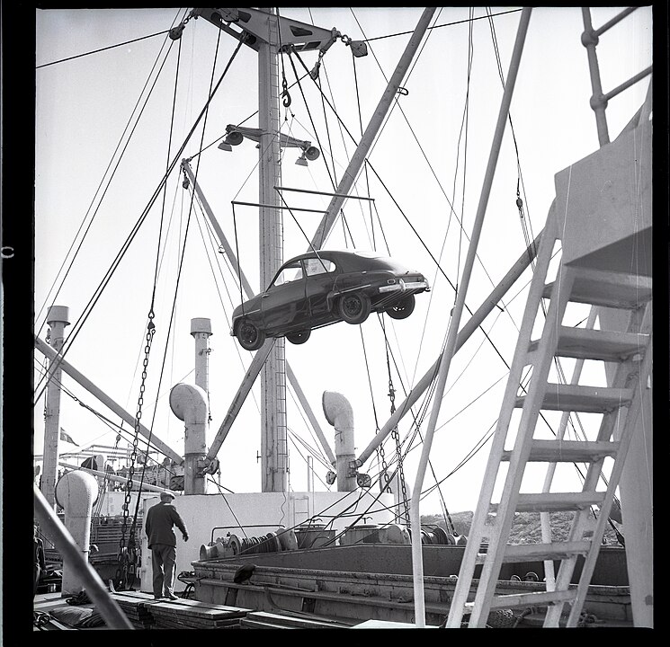 Tidig export: Det största parti bilar, som någonsin utskeppats från Uddevalla, lastades på tisdagen på mf Bullerö av Stockholm, som tog ombord SAAB-bilar på Badökajen. Inte mindre än 450 bilar lastades för vidarebefordran till USA. (Notis i Bohusläningen den 20 maj 1959). Foto Arne Andersson (1916-1993)