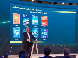 Brasilianska Volkswagen Caminhões e Ônibus har deltagit i tio IAA. Vd Antonio Roberto Cordes här på Tratons presskonferens.