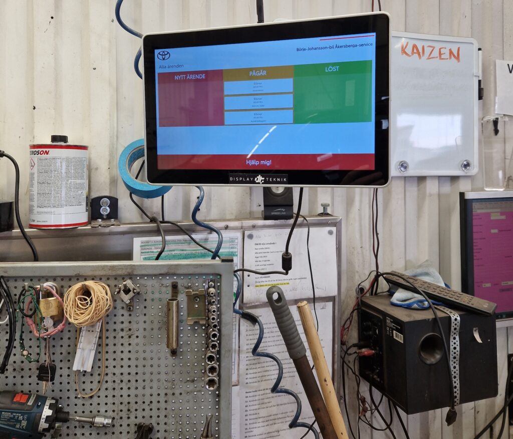 – Skärmarna sitter på väggen och när en tekniker behöver hjälp med något trycker hen på en knapp, antingen till reservdelspersonalen eller till kundmottagarna. Den som får meddelandet kvitterar meddelandet på sin skärm. För teknikern blir det ett tecken på att frågan har nått fram, och att svar kommer så snart den andra personen har möjlighet.
