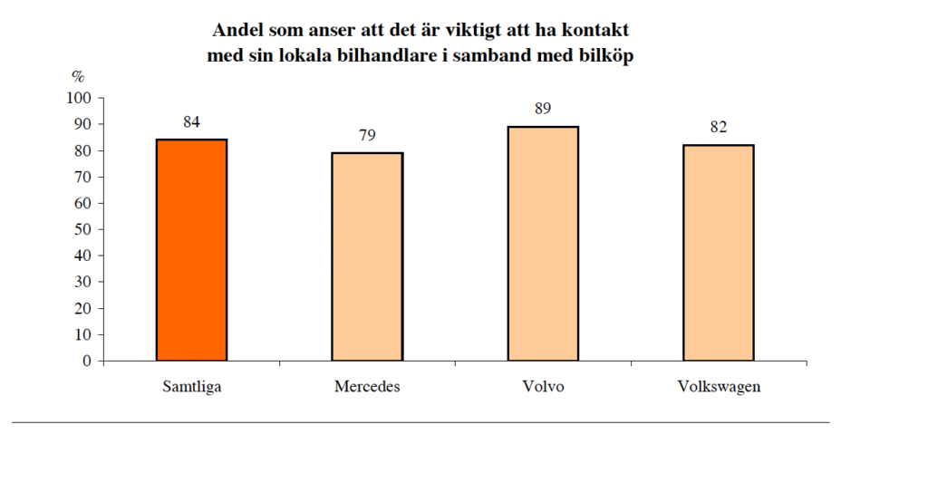 En stor majoritet anser att det är viktigt att kunna jämföra priser mellan bilhandlare som tillhandahåller samma märke. Om det är samma pris på nätet som hos en bilhandlare som är agent vill 93 procent av bilköparna helst handla hos bilhandlaren.